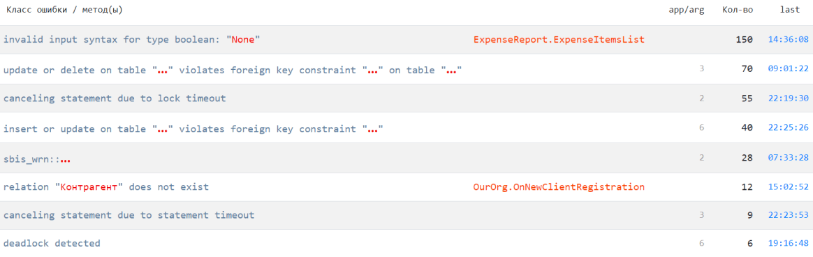Все возникающие на серверах PostgreSQL сообщения об ошибках группируются по типам, что позволяет как быстро анализировать распределение однородных событий в течение дня, так и видеть конкретные аргументы, спровоцировавшие ошибку.